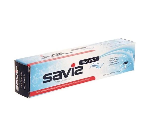 خمیردندان 80 گرمی برند «ساویز» (Saviz) محصول کشور ایران است که این برند سالهاست در زمینهی تولید محصولات آرایشی و بهداشتی فعالیت گستردهای دارد. خمیردندان ساویز حاوی فلوراید است که از پوسیدگی دندانها جلوگیری میکند. دیکلسیم فسفات و سیلیکای موجود در این خمیردندان با تاثیر خود بر روی سطوح دندانها منجربه پاکی و تمیزی دندانها میشود. وجود ماده تترا سدیم پیرو فسفات خاصیت ضدجرم دارد و از ایجاد جرم روی سطح دندانها ممانعت میکند. خمیردندان ساویز حاوی سایندههای معدنی مجاز است که به پاککنندگی دندانها کمک میکند. همچنین ساویز حاوی گلیسیرین است که موجب مرطوبکنندگی دهان و درخشانشدن دندانها میشود. خمیردندان ساویز دندانها را سفید و دهان را خوشبو میکند و باعث تقویت مینای دندانها میشود. خمیردندان مدل فلوراید ساویز بیشتر فاکتورهای موردنیاز برای یک خمیردندان خوب را داراست.